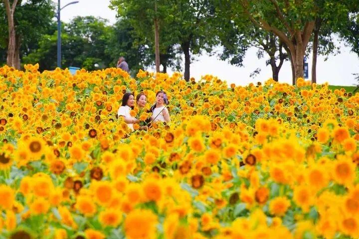 近日,记者走进南宁园博园的丝路花海,只见15000m²的重瓣向日葵正绽放成海,11.2万余株向日葵迎着阳光灿烂微笑。
