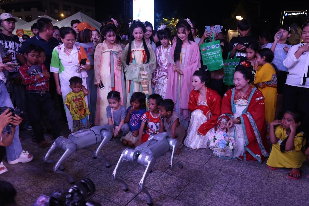 中国舞狮、柬埔寨仙女舞等表演引来当地民众阵阵掌声,现场观众纷纷驻足拍照、互动。来自中国的机器狗、数字IP驼小驼智能玩偶等科技产品为当地民众带去新奇体验。