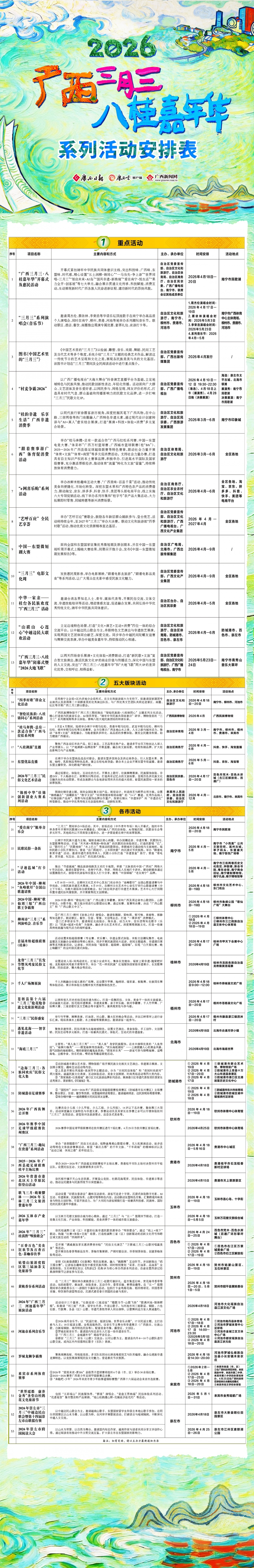 2026年“广西三月三·八桂嘉年华”文化旅游品牌活动将于4月18日上午在南宁市民歌湖启幕,今年活动以“三月三 趣广西”为主题,集中活动时间为4月18日至5月24日。其间,自治区层面将组织开展13项重点活动和“多彩民族风”“相约游广西”“民族体育炫”“e网喜乐购”“和谐在八桂”五大版块特色活动,充分体现科技味、广西味、东盟味、时代感,呈现民歌新潮、智趣盛宴、世界风情、潮玩八桂。