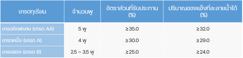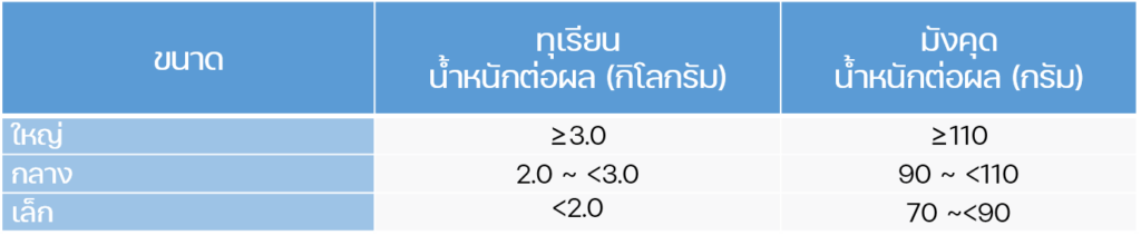 มาตรฐานฯ ได้กำหนดเกณฑ์การคัดคุณภาพตามขนาด (Size grading) เป็น 3 ขนาด ดังนี้