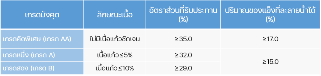 มังคุด : แบ่งเป็น 3 เกรดเช่นกัน คือ เกรดคัดพิเศษ (เกรด AA) / เกรดหนึ่ง (เกรด A) และเกรดสอง (เกรด B) โดยใช้ “ผิวเปลือก สีเปลือก เนื้อมังคุด ปริมาณของแข็งที่ละลายน้ำได้ (Soluble Solids) และอัตราส่วนที่รับประทานได้” เป็นเกณฑ์