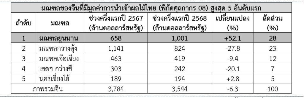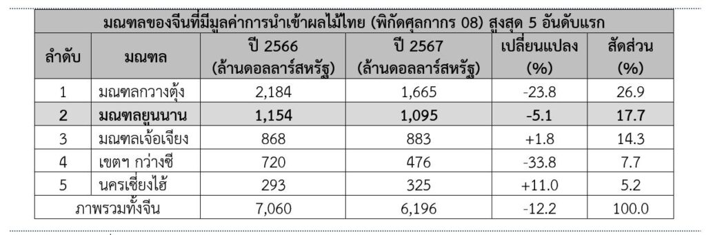 ส่งผลให้มณฑลยูนนานเป็นมณฑลที่มีด่านที่ได้รับอนุญาตให้สามารถนำเข้าผลไม้จากไทยทั้งการขนส่งโดยตรงและการขนส่งผ่านประเทศที่สาม มากที่สุดในจีน รวม 9 ด่าน จากจำนวนด่านจำเพาะเพื่อการนำเข้าผลไม้ทั้งหมด 11 ด่านทั่วมณฑลยูนนาน ครอบคลุมทั้งทางอากาศ ทางถนน ทางราง และทางน้ำ (แม่น้ำล้านช้าง-แม่น้ำโขง) ประกอบด้วย