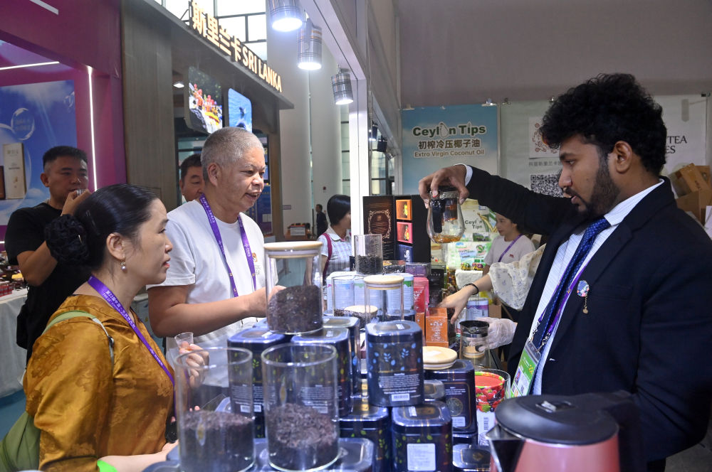 9月19日,在广西南宁国际会展中心斯里兰卡展馆,参展商(右)在向顾客推荐商品。陆波岸 摄