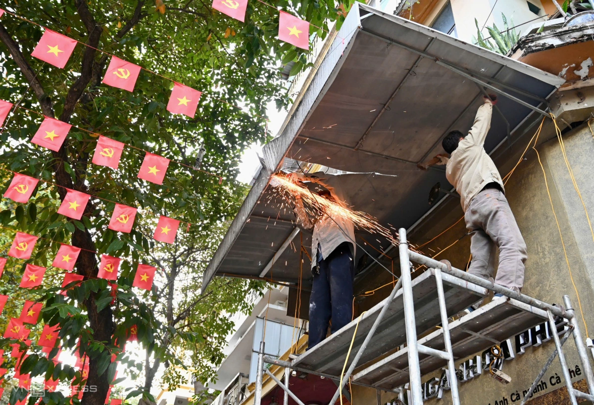 Mái che tại tầng một của ngôi nhà trên phố Hàng Mã bị tháo dỡ do vi phạm lấn chiếm.